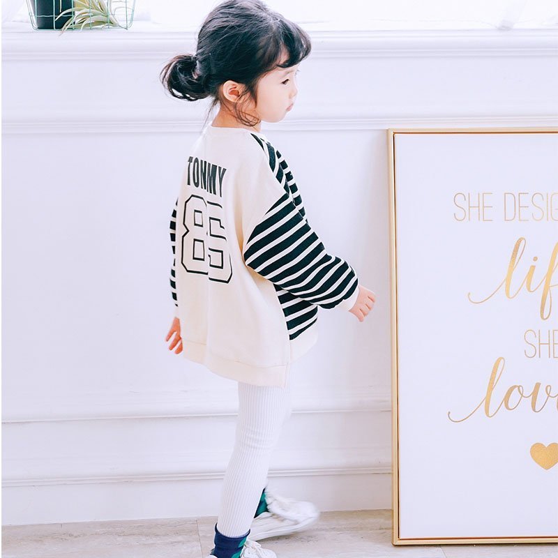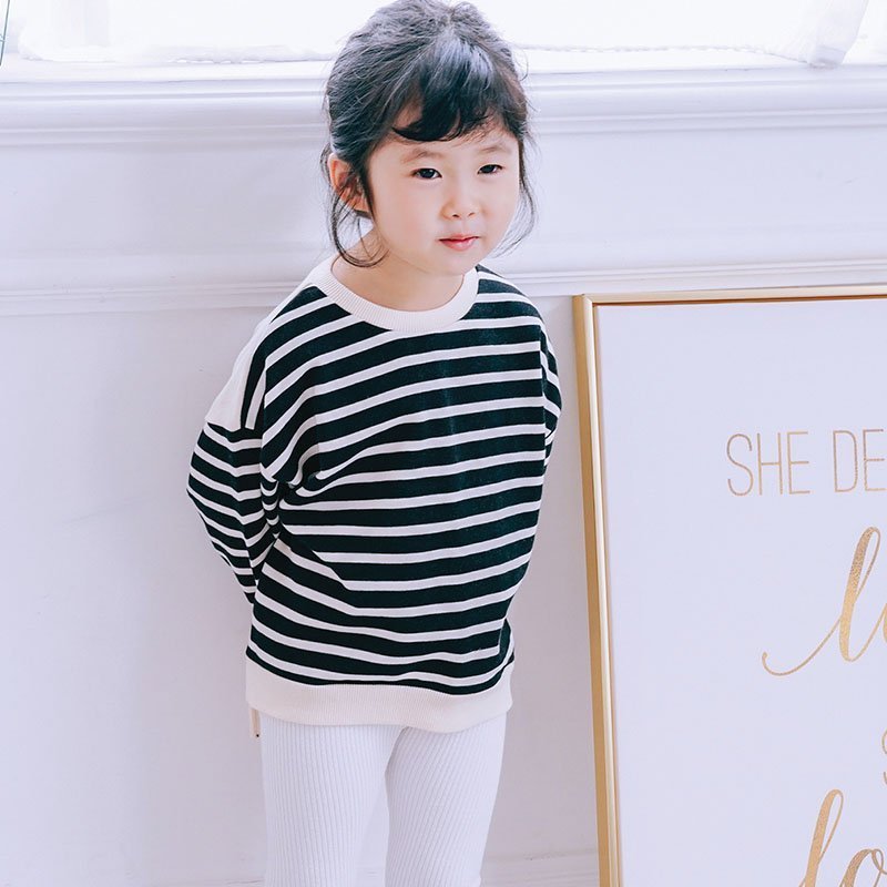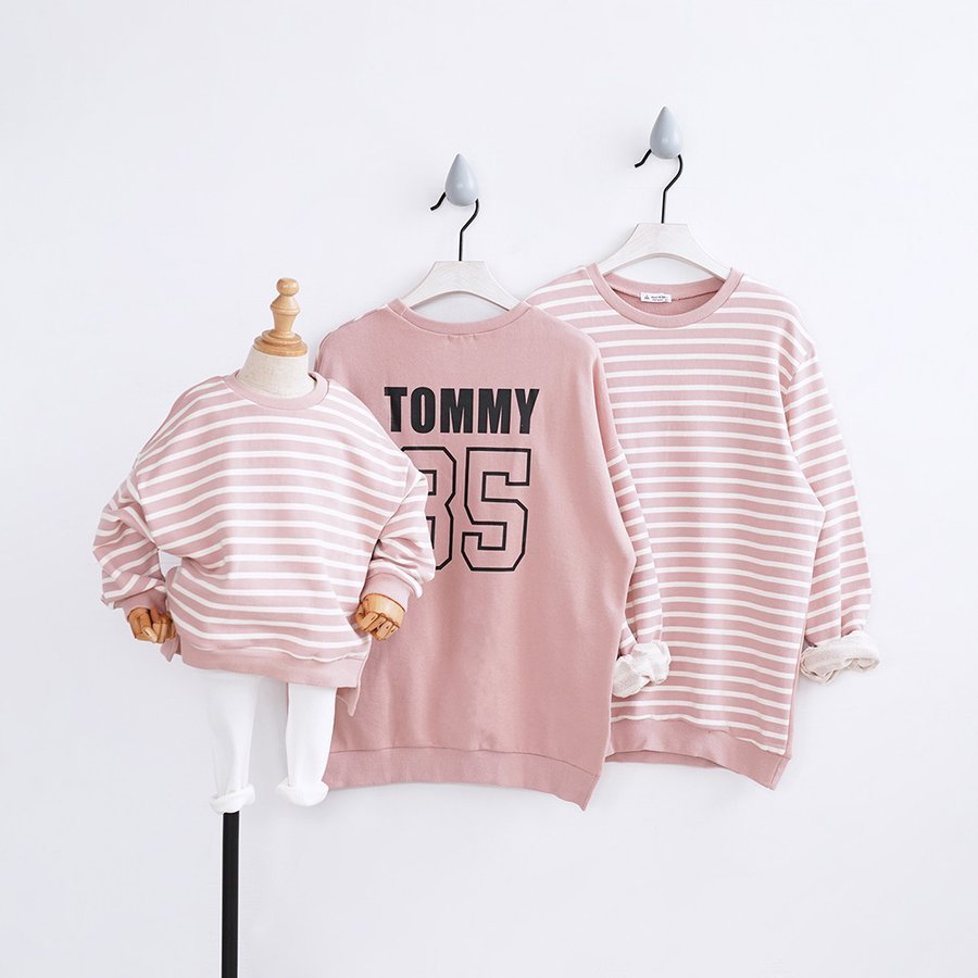 モノトーンとピンクのボーダー柄で、おしゃれな親子コーディネートが完成します。