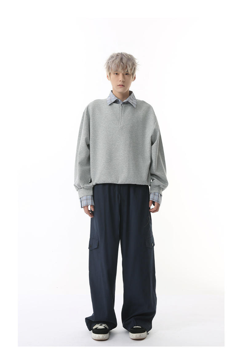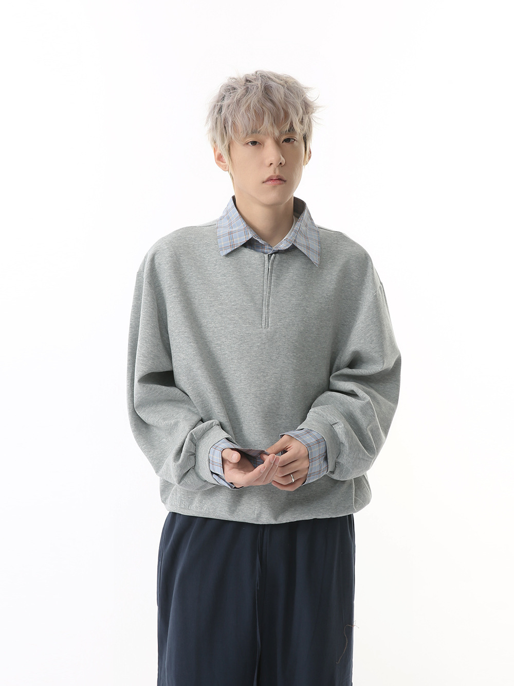 チェック柄の襟と袖が印象的な重ね着風パーカーが登場。